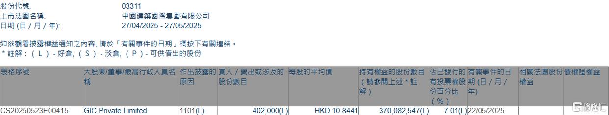 格隆汇5月27日丨根据联交所最新权益披露资料显示配资平台排名一览表,2025年5月22日,中国建筑国际(03311.HK)获GIC Private Limited在场内以每股均价10.8441港元增持40.2万股,涉资约435.93万港元。